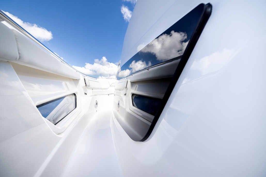 - Custom Windshield System: Powder Coated Structural Frame with Optically Clear Laminated Windshield Glass, Electrically Actuated Center Vent, Tempered Side Glass, Custom B-Pillar Caps, and 316L Stainless Steel Grab Rails (Port and Starboard)