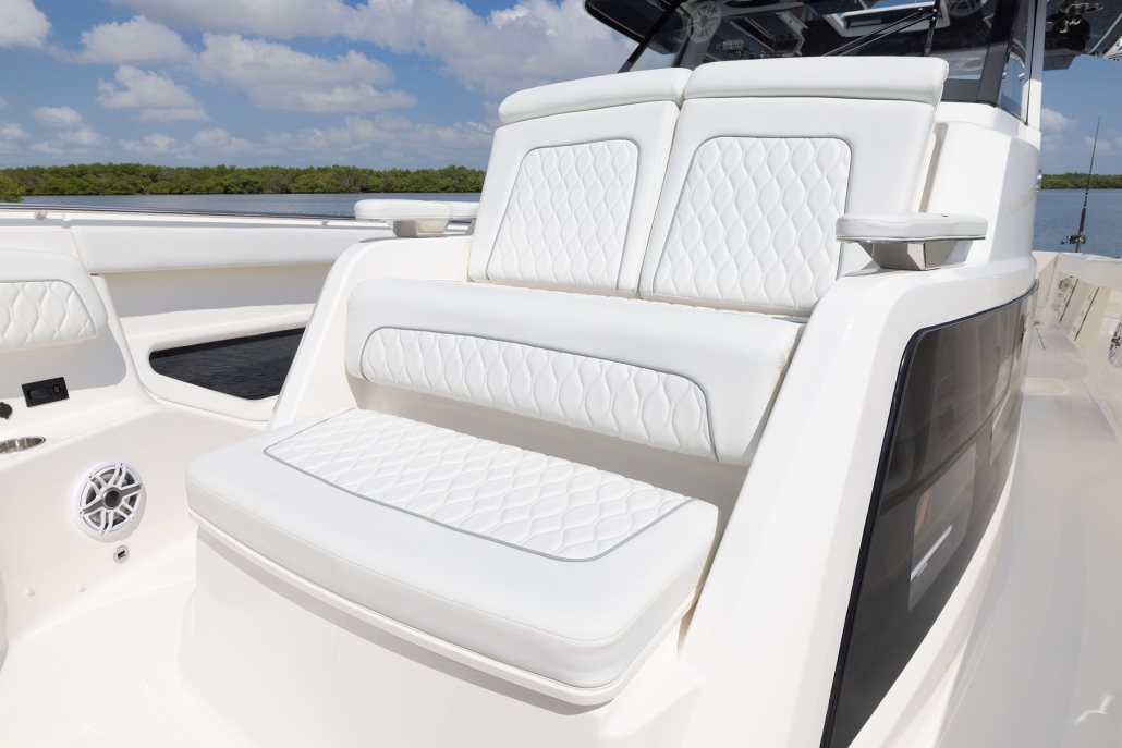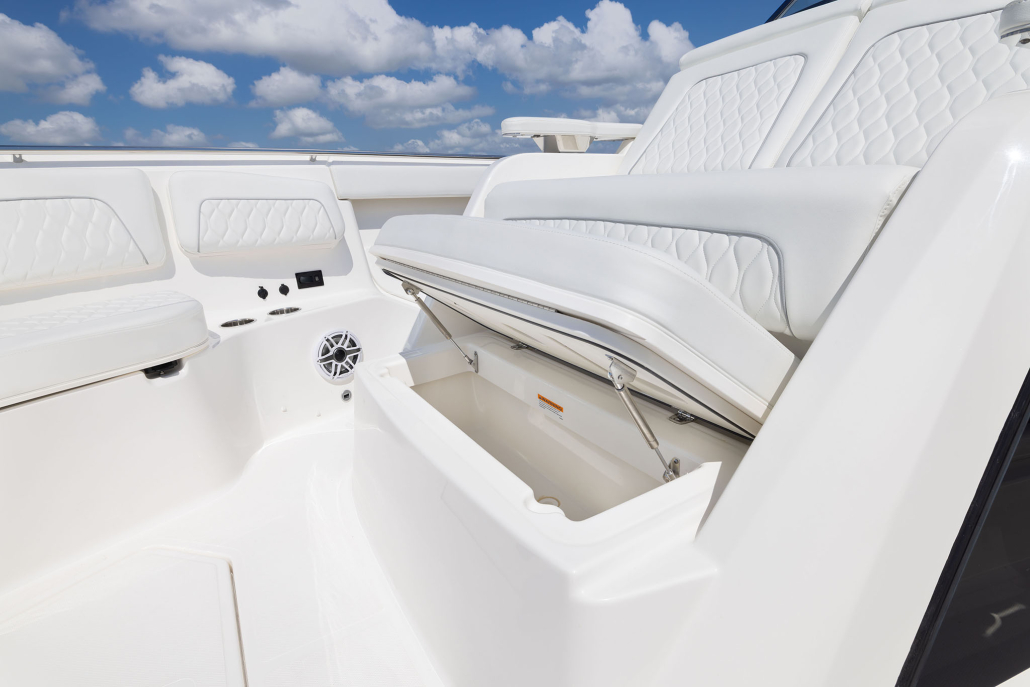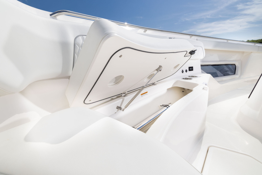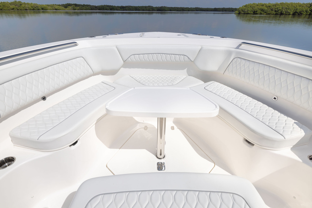 - Forward Bow Seating with Insulated Storage Below, Electrically Actuated Forward Facing-Backrests for Port and Starboard Seats, Removable Forward Jumpseat (with bow table storage below), Eight (8) Drink Holders, 12V Outlets and USB (A & C) Chargers