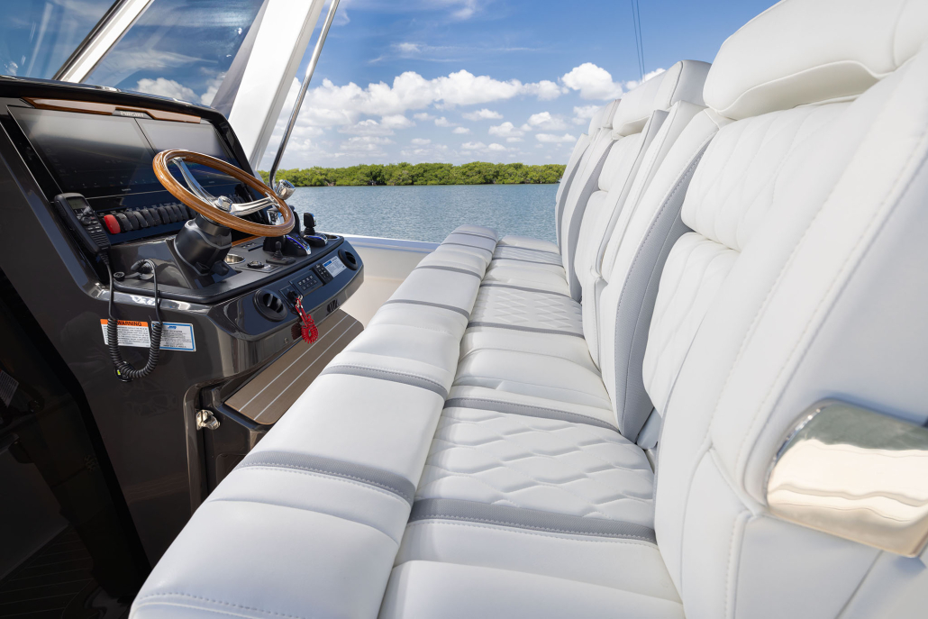 - Premium Helm Upgrade: Edson Solid Teak Steering Wheel with Power Knob, Leather-Wrapped Dash Pad (Black), Synthetic Biscuit Flooring on Helm Footrest Treads, and Teak Accents on Dash Storage Pocket and Entertainment Center
