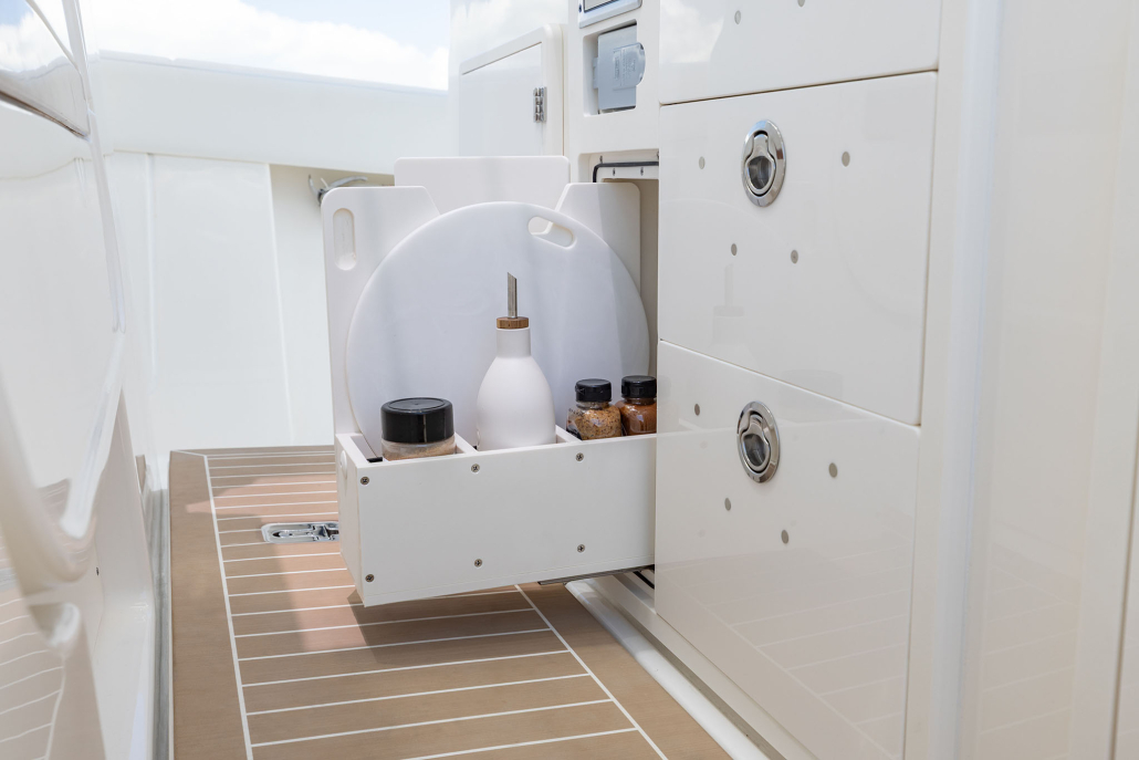 - Leaning Post with 12V Slide-Out Refrigerator/Freezer, 316L Stainless Steel Handrails, Drawer Storage Compartment, and Midship Fresh & Raw Water Outlets