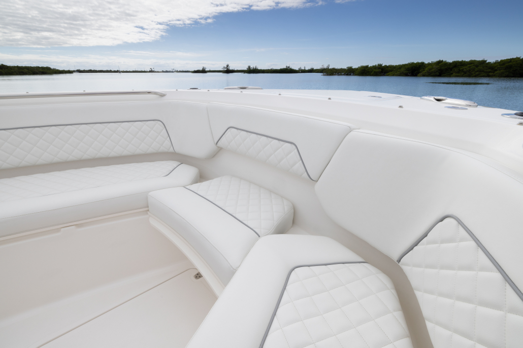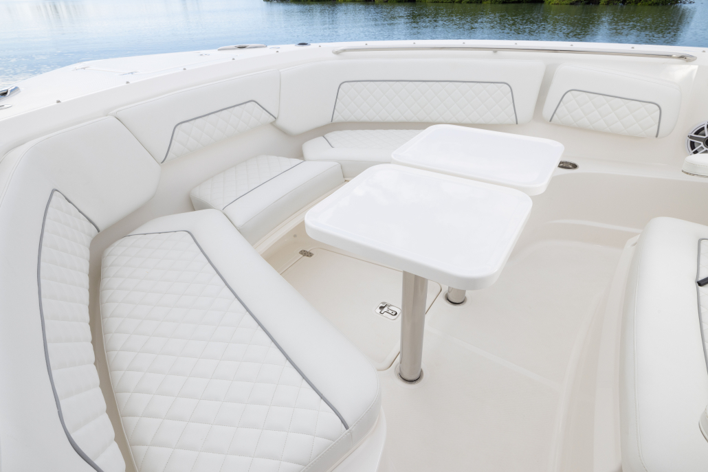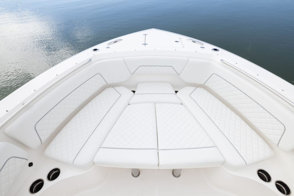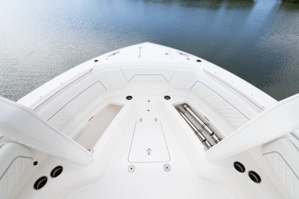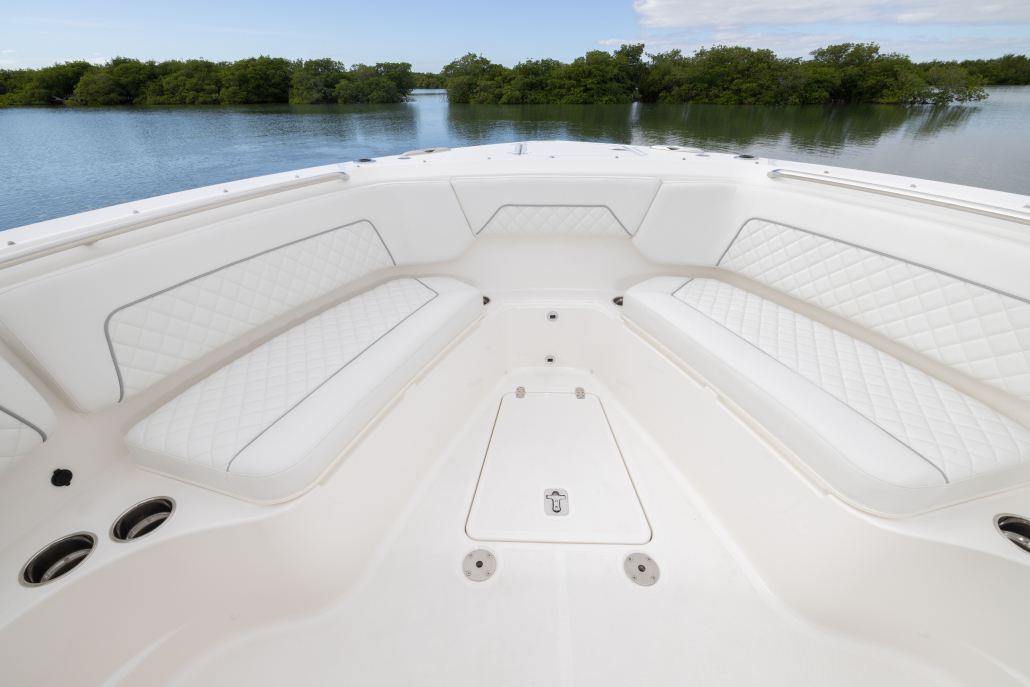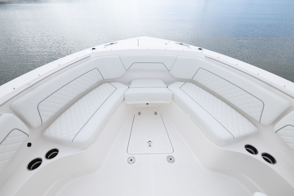 - Molded Forward Bow Seating with Insulated Storage Below, Electrically Actuated Forward Facing-Backrests for Port and Starboard Seats, Removable Forward Jumpseat, Six Drink Holders, and 12V / USB (A & C) Outlets