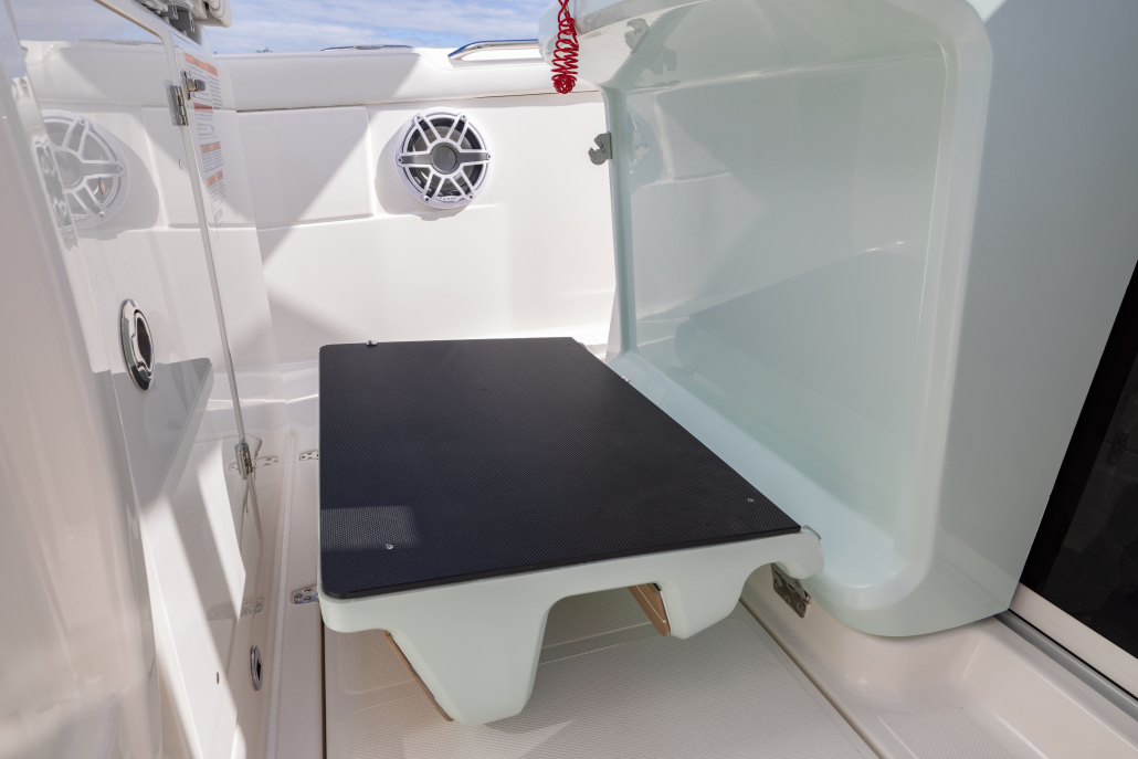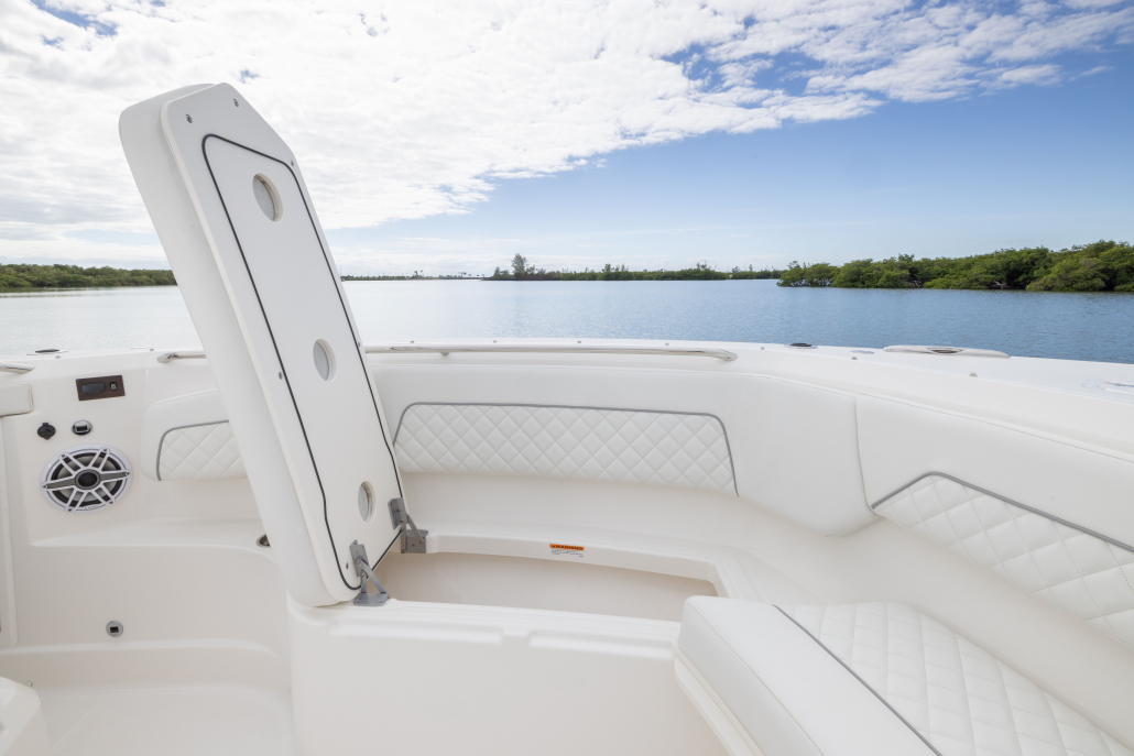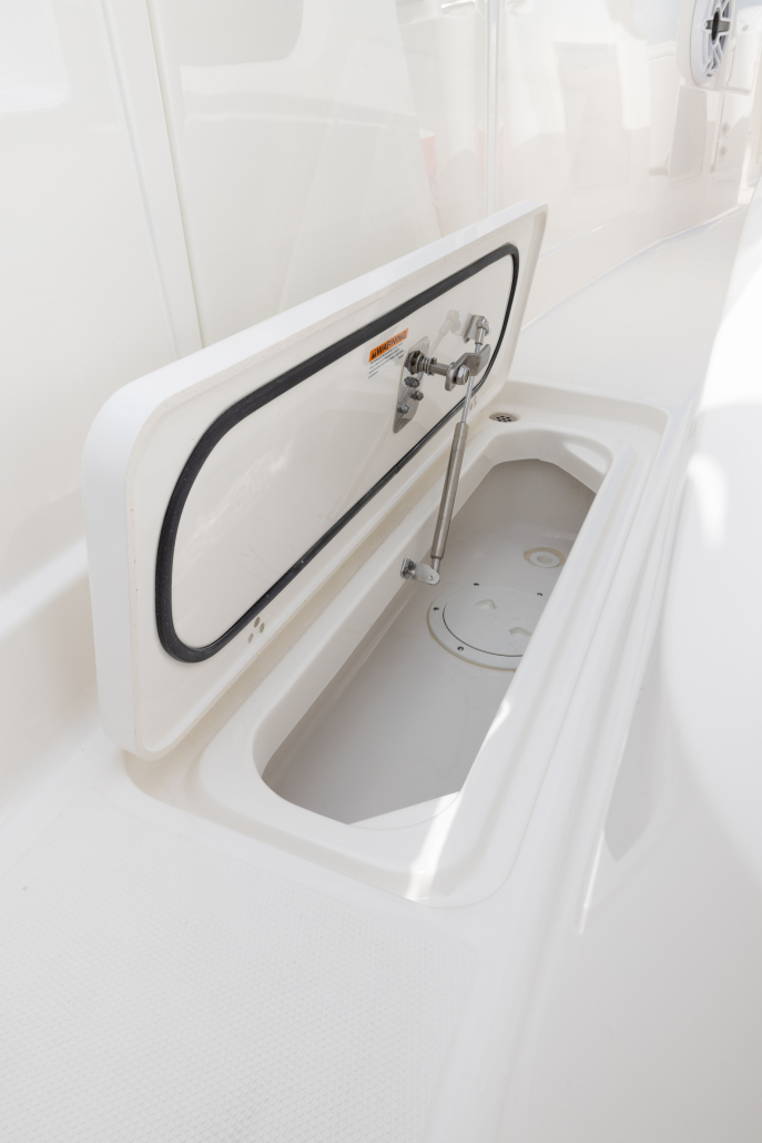 - Port and Starboard Forward Coaming Storage Bins with Dedicated Table & Dock Line Storage, and Lockable Lids