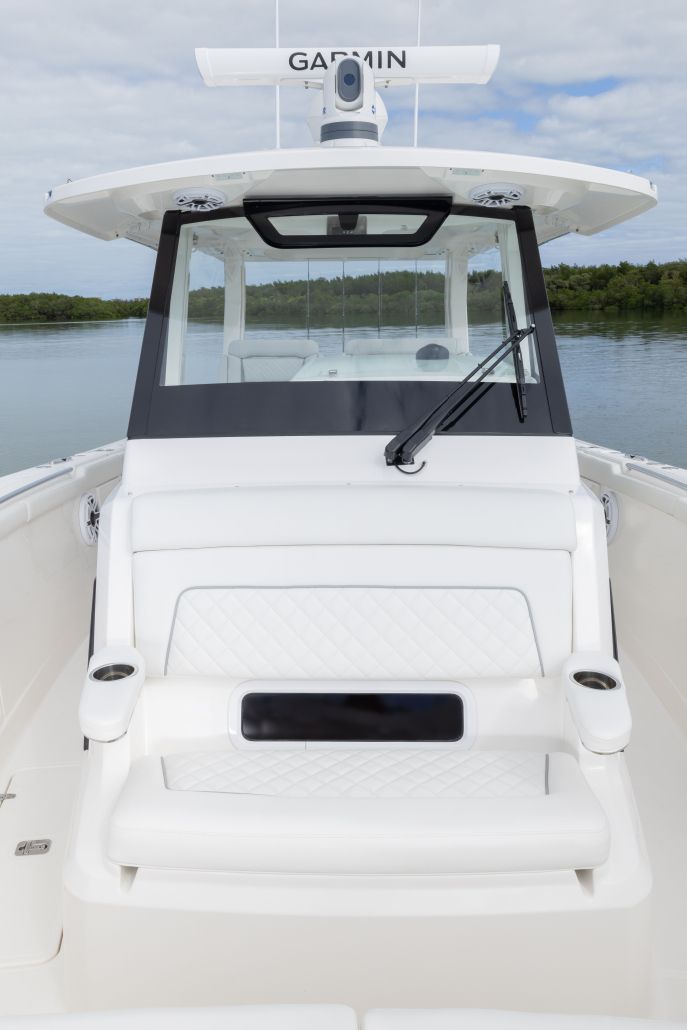 To start, on the top deck we have increased the storage to include an insulated transom cooler, in-floor gear storage and more drink and rod holders. Even the entertainment center has more storage with two new drawers. The improved wide-open layout and seating configuration make transitions from heart-pounding reeling to comfortable cruising incredibly easy. Upgrade options at the helm include additional teak accents, solid teak Edson steering wheel and leather dash pad, for the utmost luxury in captaining.