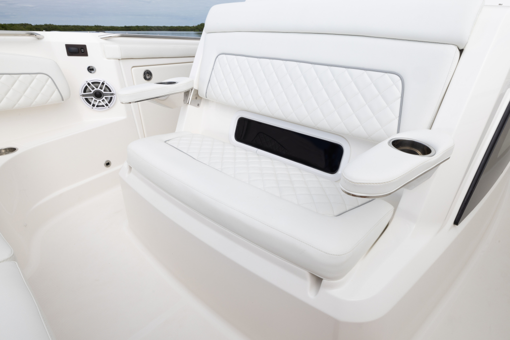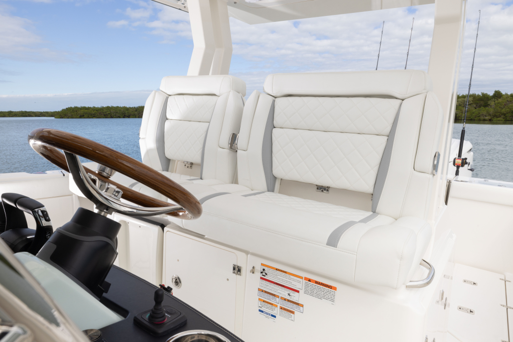- Custom 60/40 Helm Seating Configuration with Independent Foldable Armrests (4), Two (2) Articulating Flip-Up Bolsters and Lumbar Support, Fore & Aft Adjustment on Captain’s Chair and Fold Out Footrest for Companion Seat