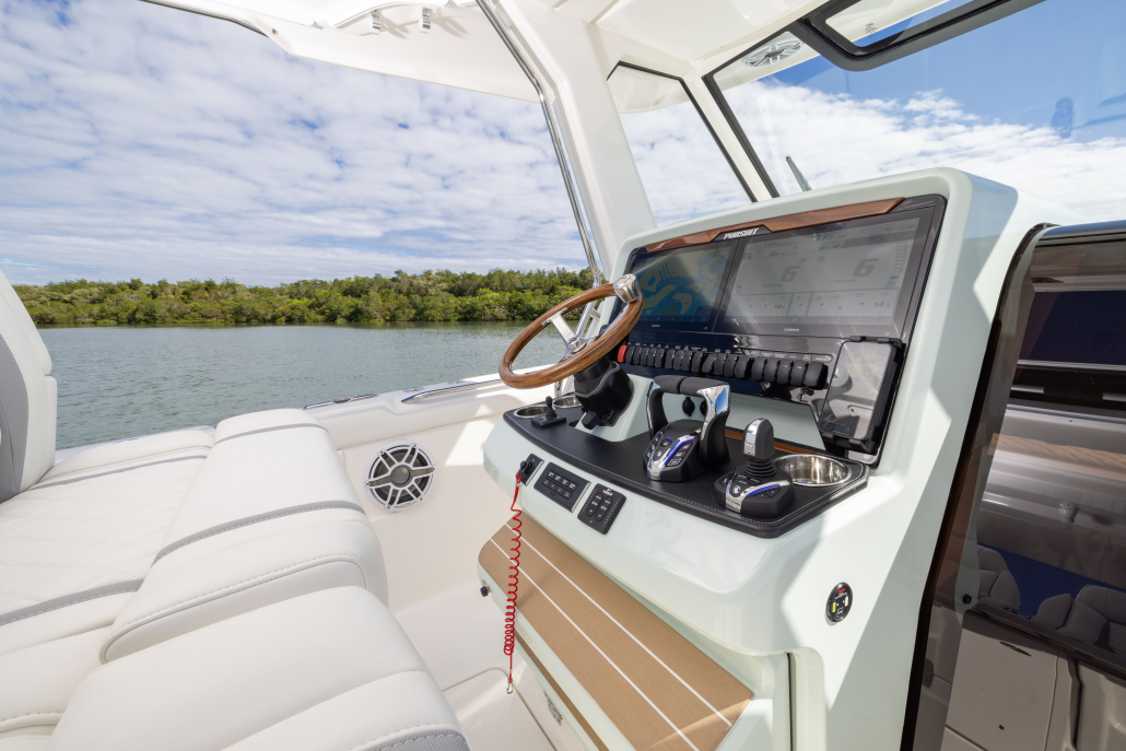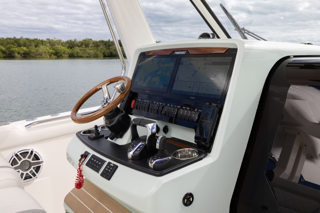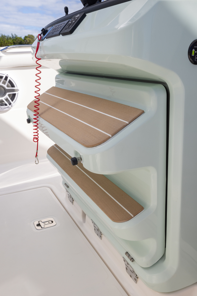 - Molded Fiberglass Aft Tilting Helm with Molded-In Instrumentation Visor, Wood Accent Trim, Electronics Mounting Surface (Accommodates Dual 16” Displays), Molded-In Storage Cubbies and Fold Out Fiberglass Footrest/Platform