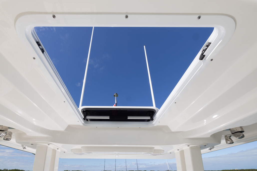 - Molded Fiberglass Full Beam Hardtop with Large Sliding Access/Ventilation Hatch, Integral Grab Rails (Topside and Windshield B-Pillars), Overhead Electronics Mounting Surface and Dedicated Locations for Outriggers and Electronics