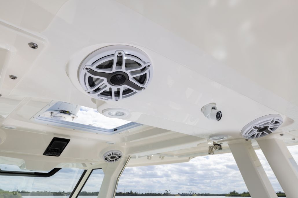 - Audio Entertainment System: JL Audio Stereo System with Bluetooth® Compatible Media Master MM105-HR Hidden Source Unit, Helm-Mounted Volume Control Knob, Premium M6 Coaxial Speakers with Classic Grilles – (4 Hardtop, 2 Bow), 10″ Subwoofer (1), Amplifier, Wireless Remote Control, and FM Antenna with Ratchet-Mount Base